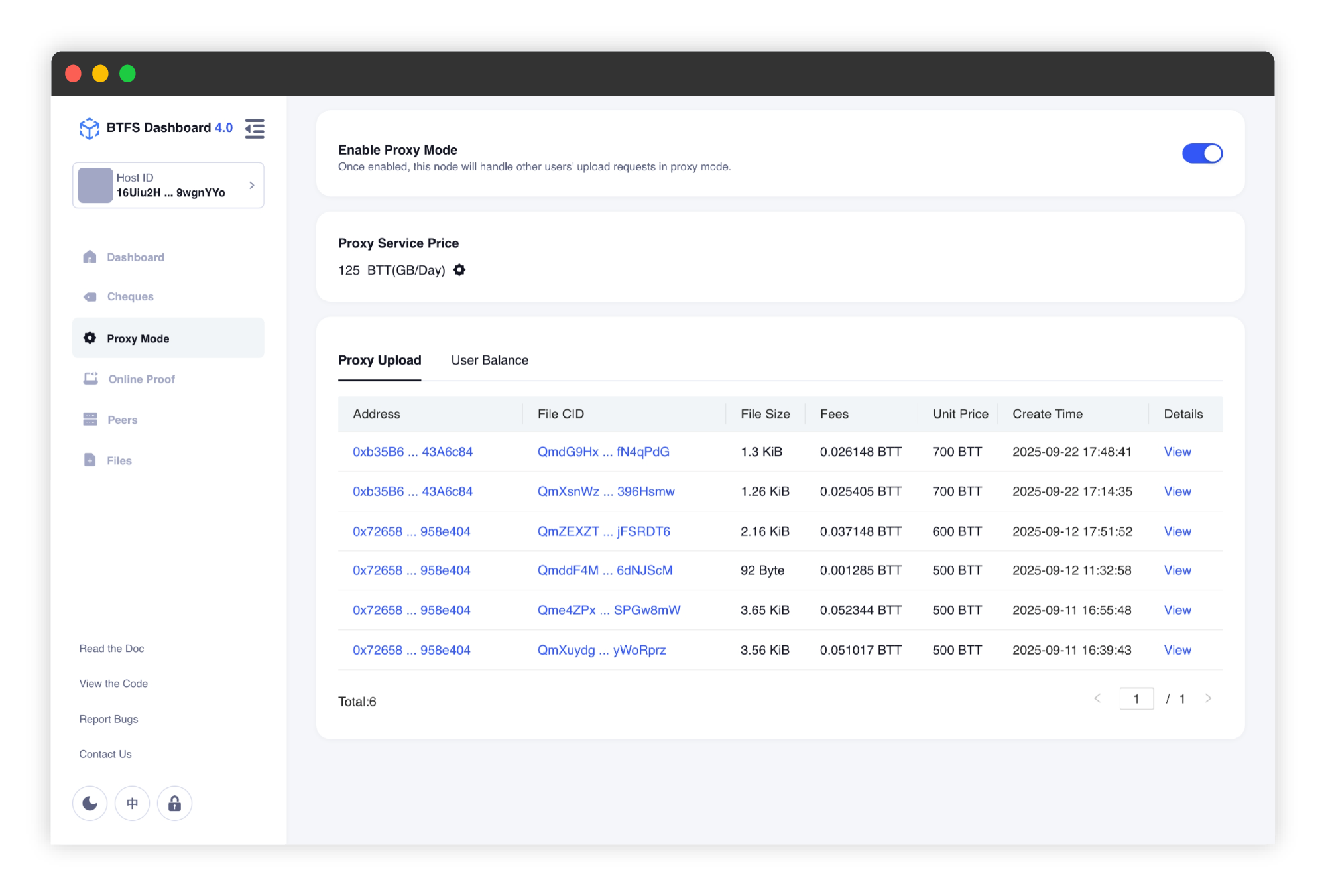 - Proxy Mode: Enable the node’s Proxy Mode, configure proxy storage pricing, and view user upload records as well as user account balances and transaction histories.